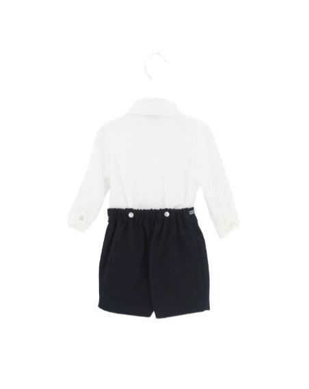 Completo Ponto Por Ponto composto da camicina in franella con righe blu ed azzurre, pantaloni con papillon abbinato in gabardine. La camicia è legata ai pantaloni con bottoni a scomparsa.