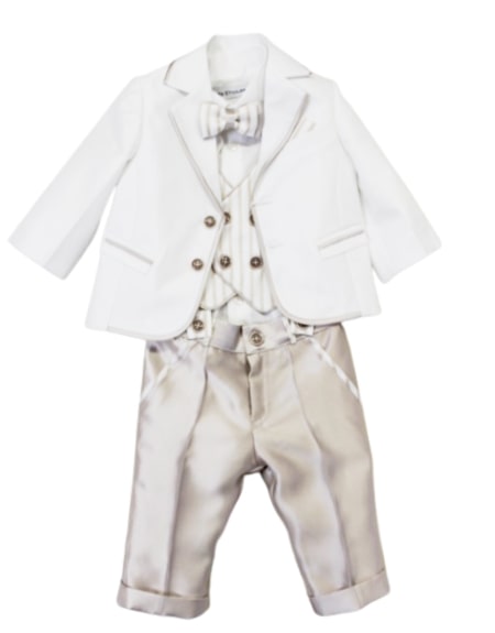 COMPLETO BATTESIMO GIACCA TINTA UNITA GILET A RIGHE DOPPIO PETTO CAMICIA PAPILLON E PANTALONE LUNGO CON BRETELLE