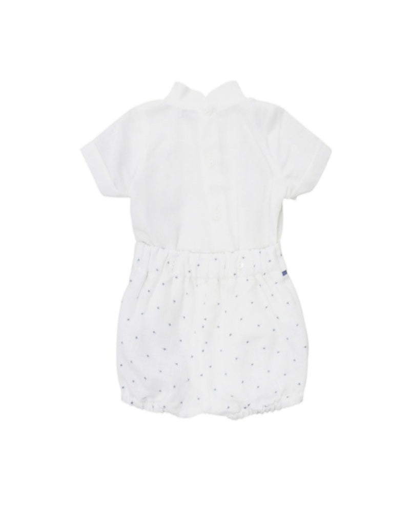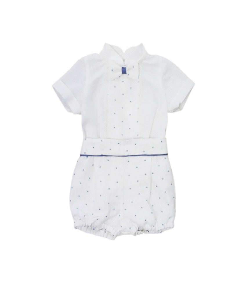 Rischia tutto con il completo di lino Ponto Por Ponto! Con camicia a pistagna, papillon con merletto e fantasie nodini, e pantaloncino culotte a contrasto. Un look audace e avventuroso per una cerimonia indimenticabile!