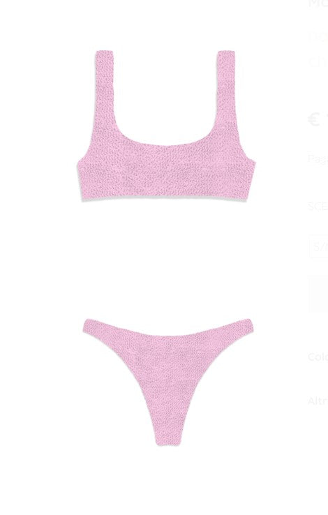 Bikini in tessuto elasticizzato goffrato, slip a brasiliana, reggiseno modello bralette, bretelle sottili regolabili.