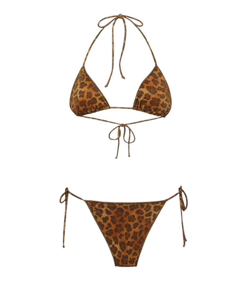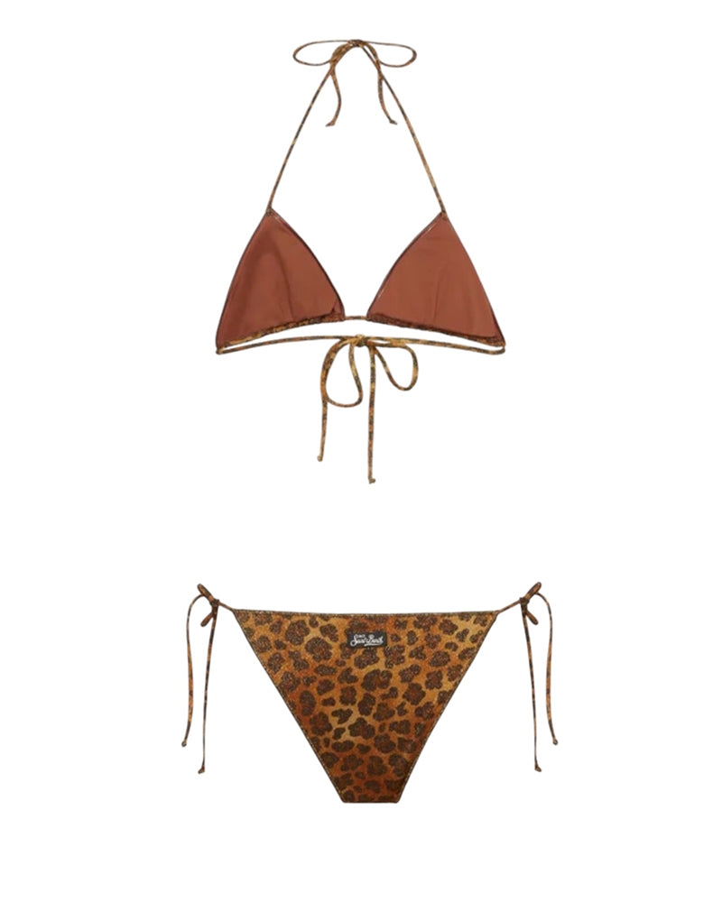 Bikini in fantasia animalier lurex, reggiseno a triangolo con laccetti e imbottitura removibile, slip con laccetti.