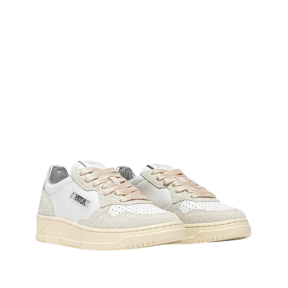 Questa sneaker da donna rappresenta una nuova tipologia di Medalist, realizzata in pelle bianca con originali inserti effetto glitter, per un originale mix tattile e grafico.