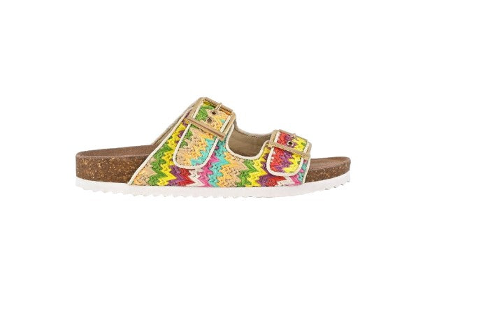 Questo modello di ciabatta a doppia fascia è infatti un'esplosione di tonalità vivaci e sgargianti che saprà donare ad ogni mise allegria e fantasia. La tomaia in morbida rafia conferisce al sandalo leggerezza