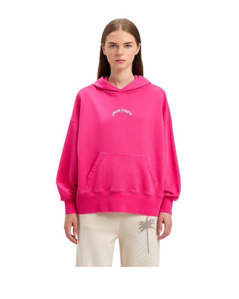 Felpa oversize con cappuccio a maniche lunghe di Palm Angels, stampa logo curved sul davanti e in rosa tenue sul retro, polsi e orlo a coste.