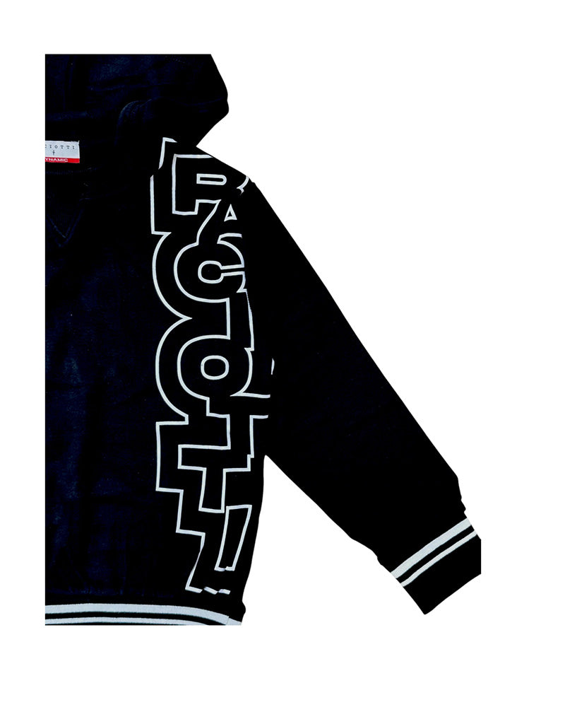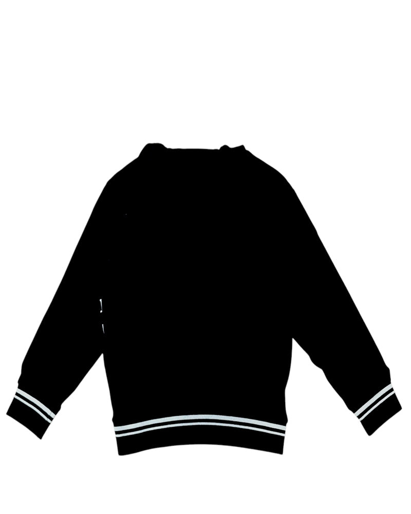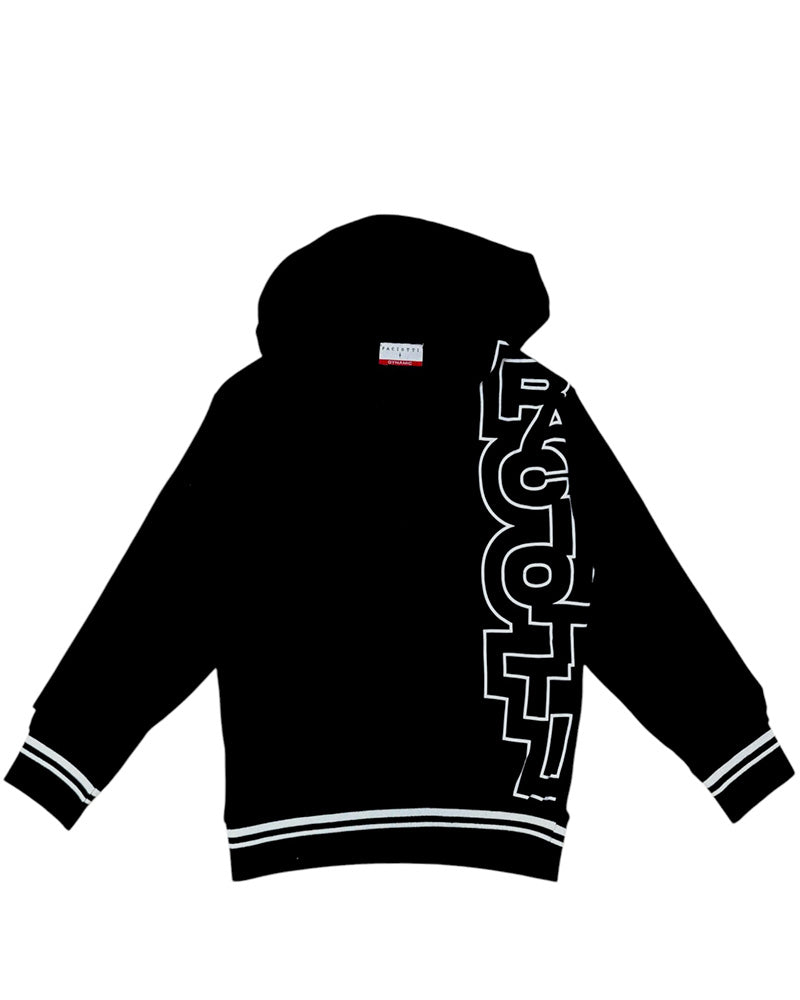 Felpa realizzata in cotone con cappuccio, logo stampato in contrasto, finiture in costa con righe orizzontali a contrasto.