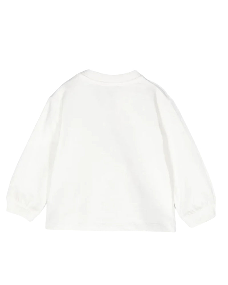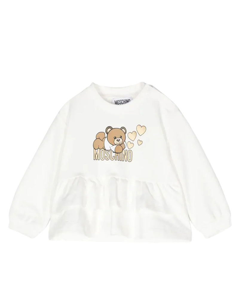 Felpa girocollo realizzata in jersey di cotone felpato. Presenta maniche lunghe, chiusura con clips sulla spallina, stampa glitter Teddy e logo frontale, ruches sul fondo, collo e polsi a coste.