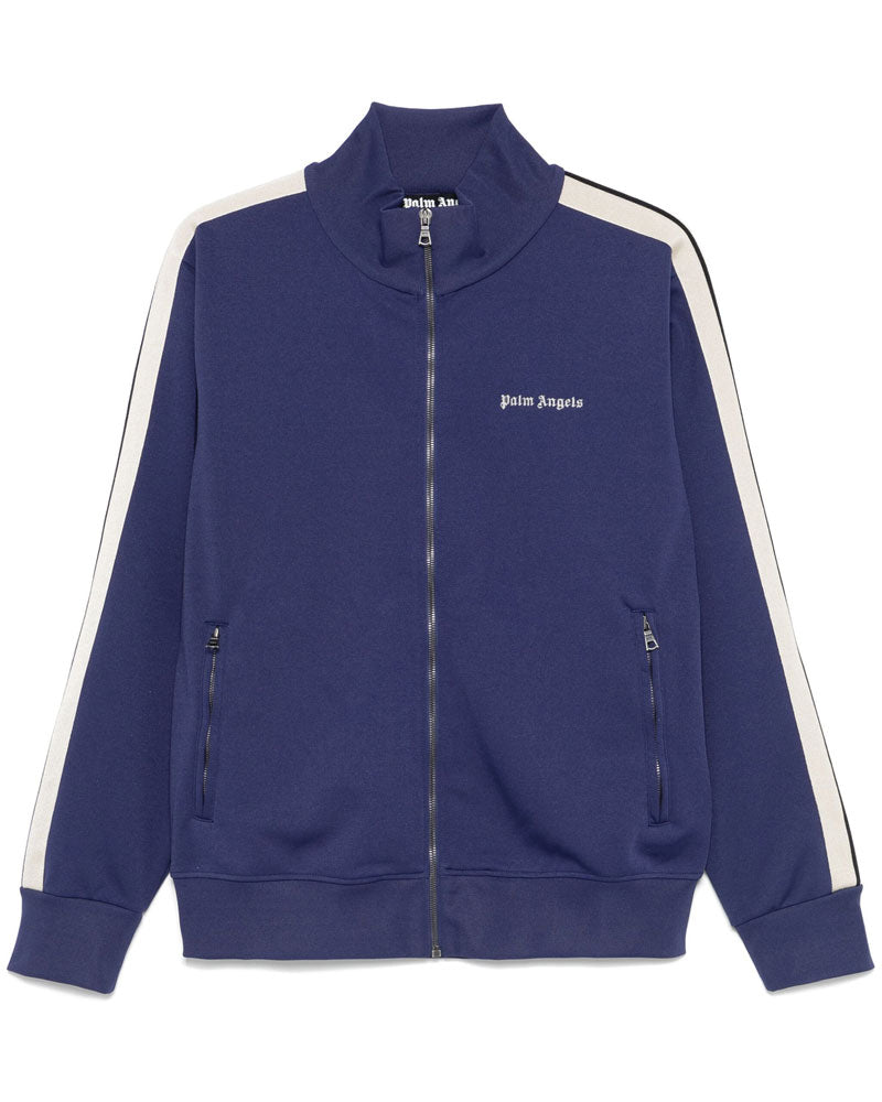 Felpa track in acetato a maniche lunghe di Palm Angels. Presenta chiusura frontale con zip, logo ricamato sul petto, due tasche laterali con zip, bande in maglia écru sulle maniche, rifiniture a coste.