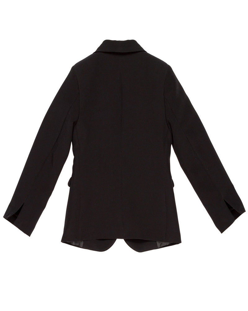 Giacca monopetto nera da bambina, caratterizzata da colletto a revers, chiusura frontale con bottoni, maniche lunghe e due tasche con patta sul davanti.
