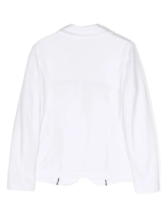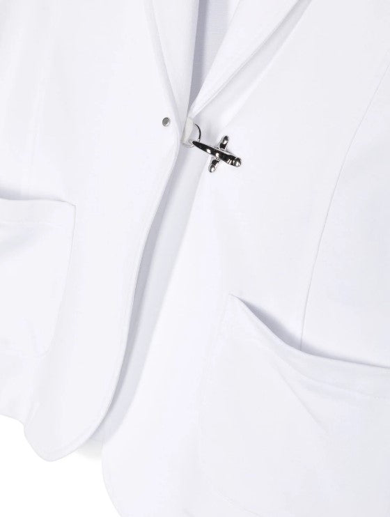 Giacca in felpa di cotone, modello monopetto, chiusura anteriore con gancio, tasche applicate sul davanti.