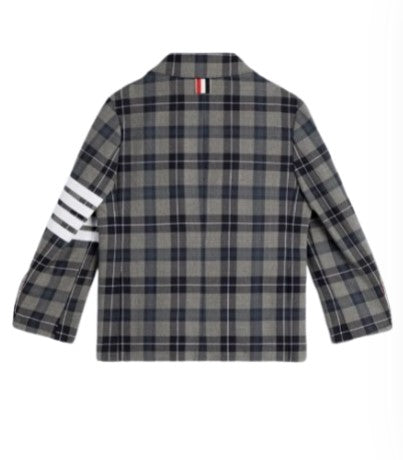 Giacca monopetto da bambino, fantasia a quadri, chiusura frontale con bottoni, due tasche con patta sul davanti.
