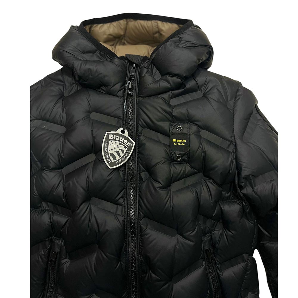 Giubbino Blauer Junior realizzato in nylon lucido. Presenta design trapuntato a onde, imbottito con piuma 90/10, cappuccio fisso con bordo elasticizzato, chiusura frontale con zip nascosta, maniche lunghe con polsi elasticizzati, due tasche laterali con zip e fondo elasticizzato. È decorato con patch e passante con logo.