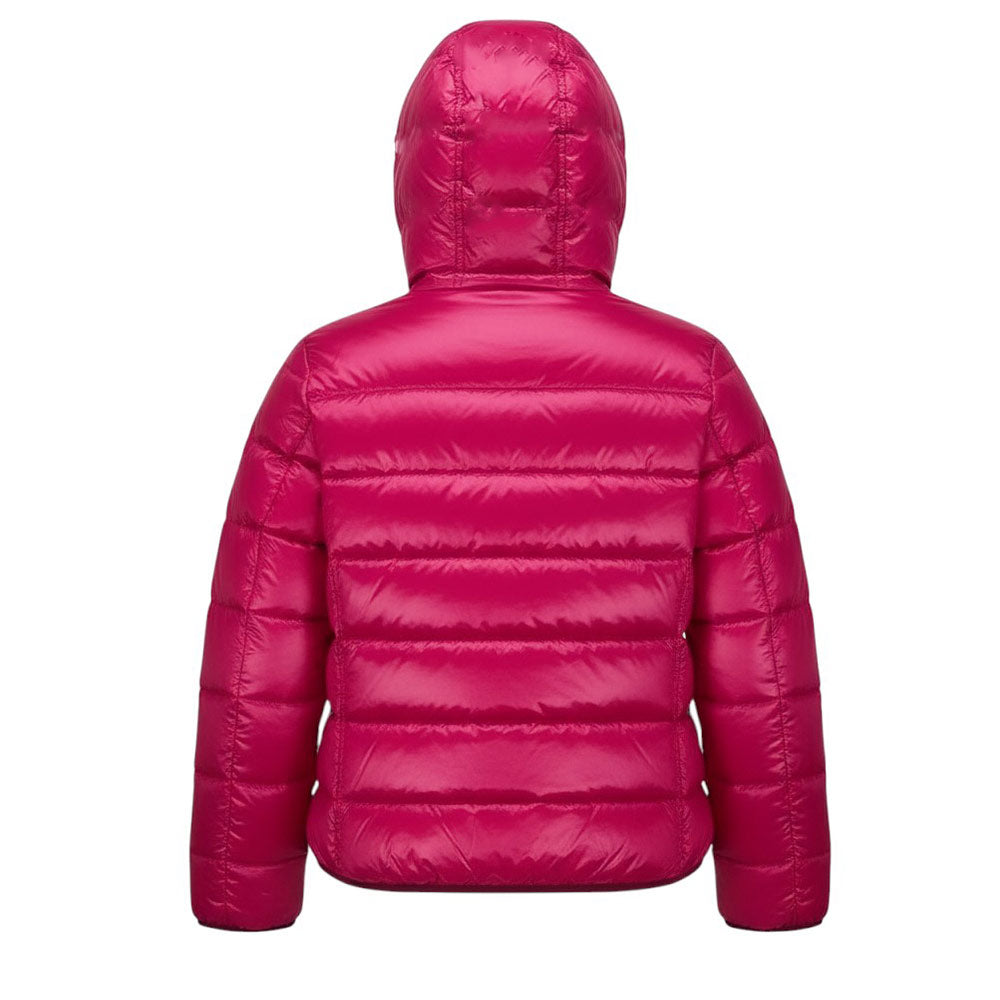 Giubbino imbottito da bambina, realizzato in nylon semilucido. Presenta design trapuntato, cappuccio fisso con coulisse regolabile, chiusura frontale con zip e bottoni a pressione, maniche lunghe con polsi elasticizzati e due tasche a filetto con zip sul davanti. È decorato con logo ricamato sul petto.