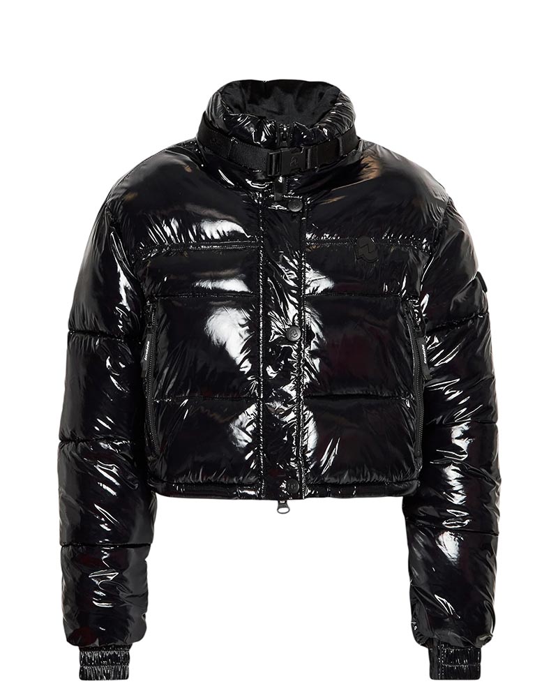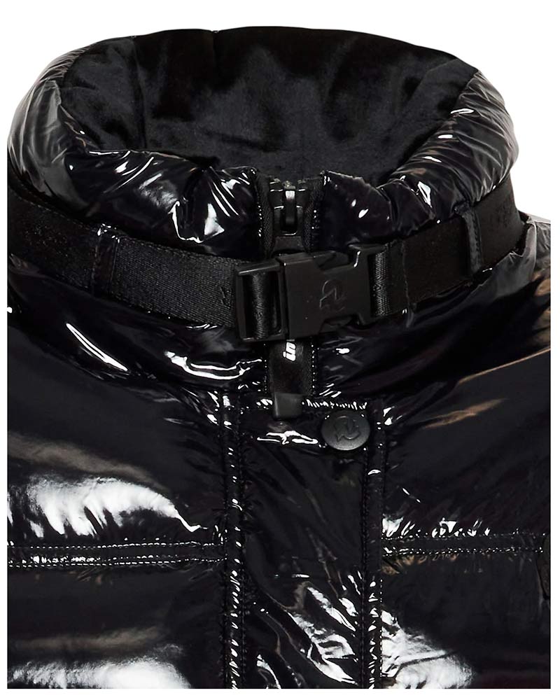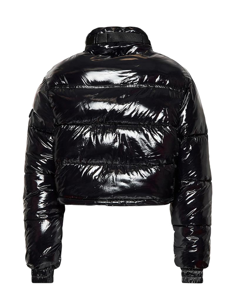 Giubbino imbottito nero da bambina, realizzato in nylon lucido effetto glossy. Presenta design trapuntato, collo alto, maniche lunghe con polsi elasticizzati, chiusura frontale con zip e bottoni a pressione, due tasche a filetto laterali e orlo dritto con coulisse regilabile. È decorato con patch logo applicata sulla manica.