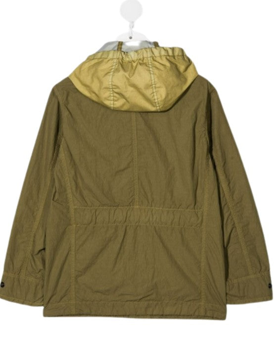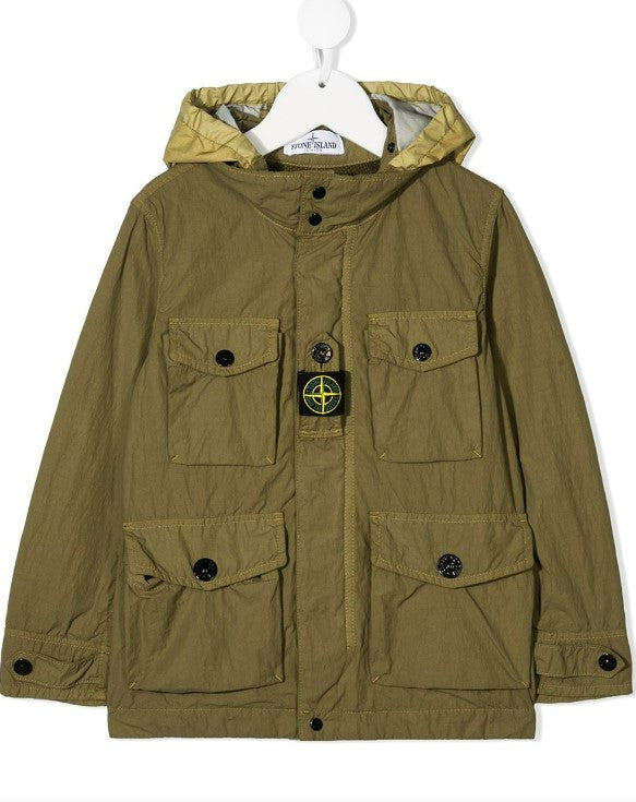 Giubbino bimbo in nylon con cappuccio estraibile, chiusura anteriore con zip e bottoni a pressione, due tasche applicate sul davanti, patch logo sul davanti.