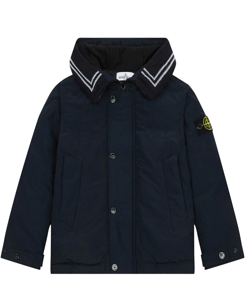 Giubbino imbottito blu da bambino. Presenta cappuccio fisso con profili in lana, chiusura frontale con zip e bottoni, maniche lunghe e due tasche a filetto sul davanti. È decorato con Badge Stone Island sulla manica sinistra.