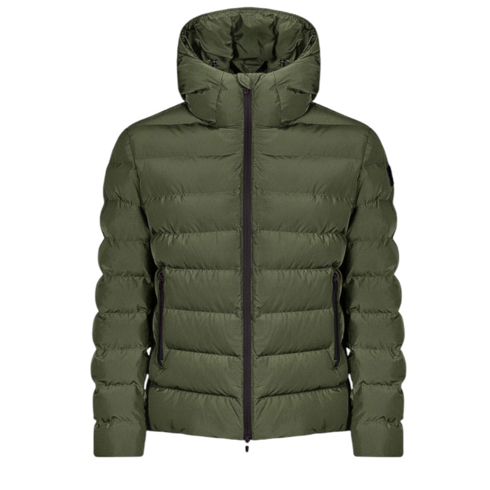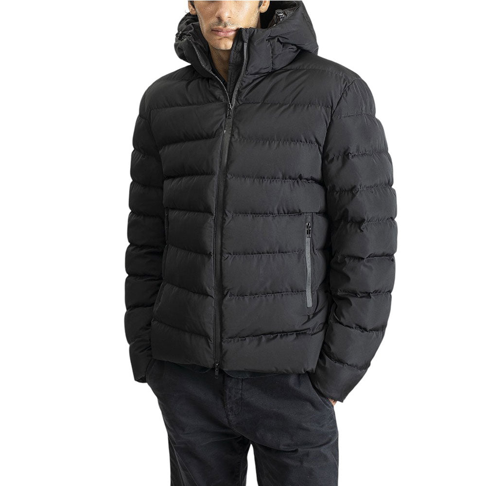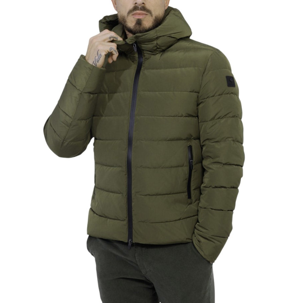 Giubbino imbottito da uomo Brochet, realizzato in tessuto Memory impermeabile. Presenta design trapuntato, cappuccio fisso con coulisse, chiusura frontale con zip a doppio cursore, maniche lunghe e due tasche laterali a filetto con zip. È decorato con patch logo applicata sulla manica.