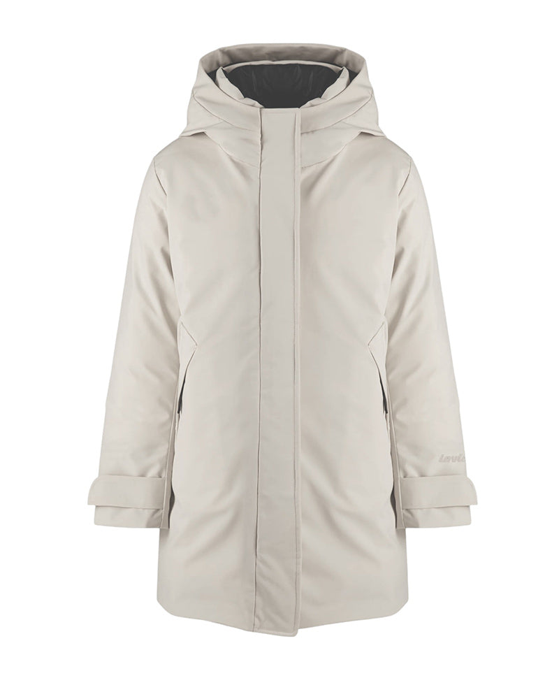Giubbino imbottito avorio, realizzato in tessuto tecno soft shell. Presenta cappuccio fisso, maniche lunghe con manicotti, chiusura frontale con zip e velcro, due tasche all'americana laterali e orlo dritto. È decorato con logo ricamato sulla manica.