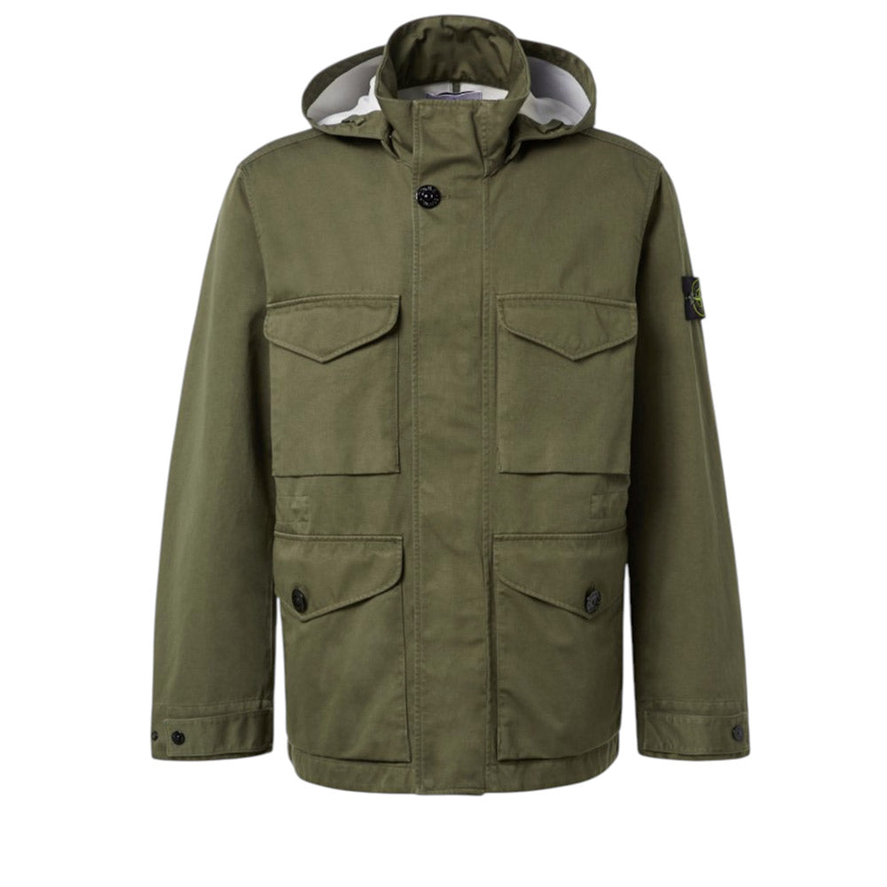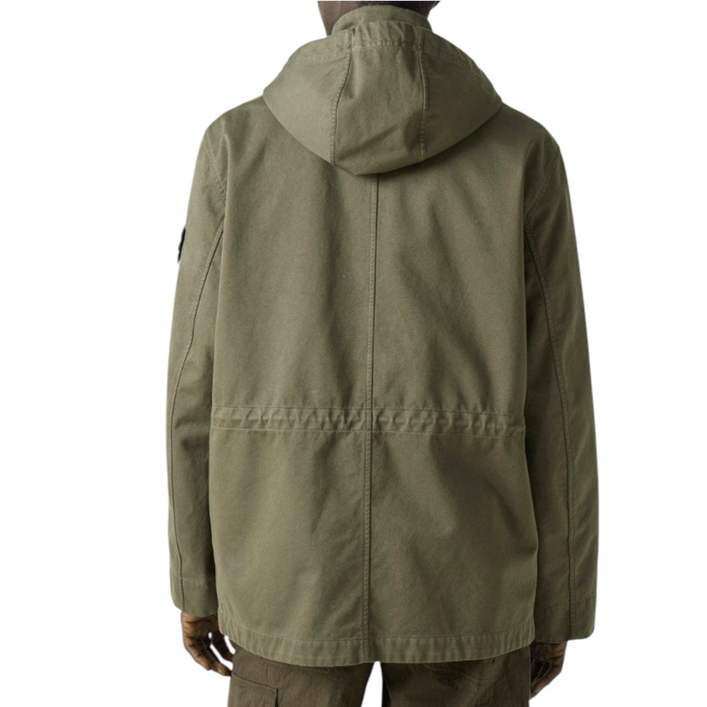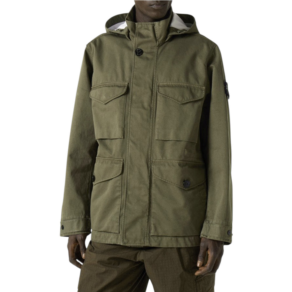 Giacca verde militare da uomo realizzata in cotone Raso Gommato 3L. Presenta cappuccio rimovibile, chiusura frontale con zip e bottoni a pressione, maniche lunghe, polsini con chiusura a bottone automatico, quattro tasche con patta frontali. È decorata con Badge Stone Island sulla manica.