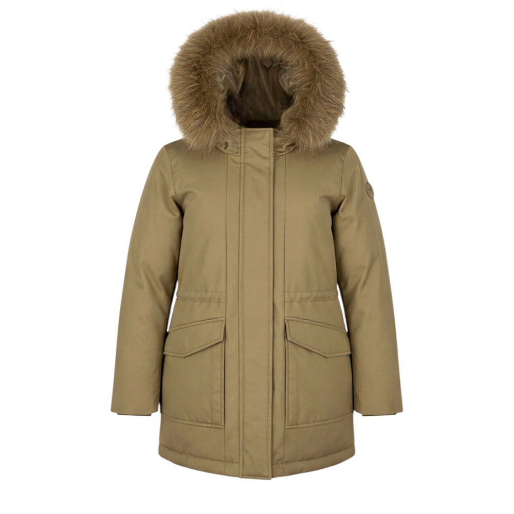 Arctic Parka realizzato in tessuto Ramar Cloth. Presenta ampio cappuccio fisso con bordo in pelliccia di capra, chiusura frontale con zip e patta, maniche lunghe con polsi a coste, due tasche con patta applicate sul davanti e orlo dritto. È decorato con patch logo applicata sulla manica.