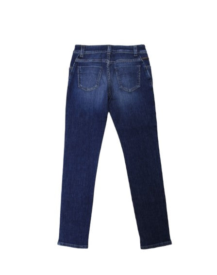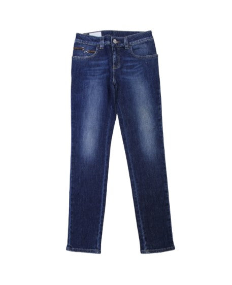 Jeans in denim, modello cinque tasche. Chiusura frontale con bottone e zip.
