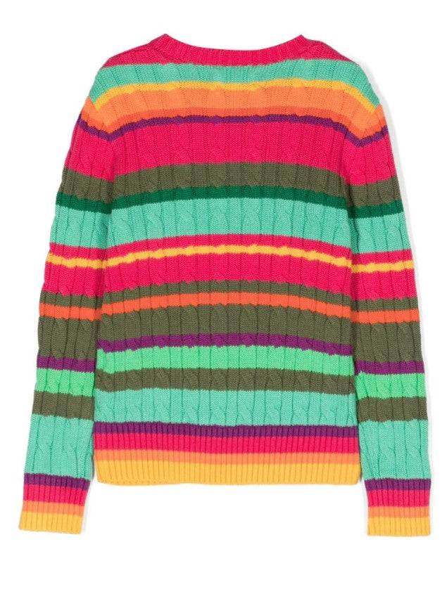 Maglia girocollo a manica lunga in filo di cotone da bambina, motivo a treccia con motivo a righe multicolor, simbolo del brand ricamato sul petto, rifiniture a costa.