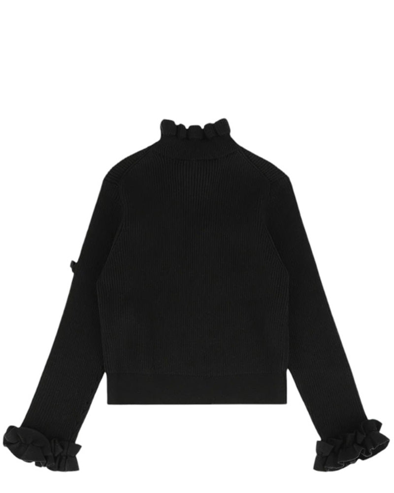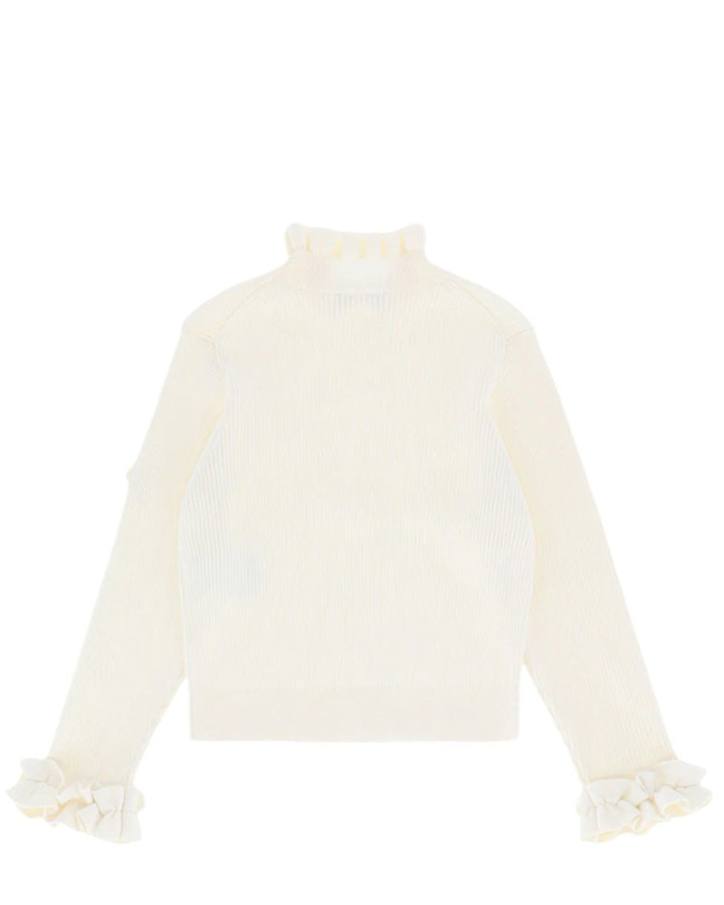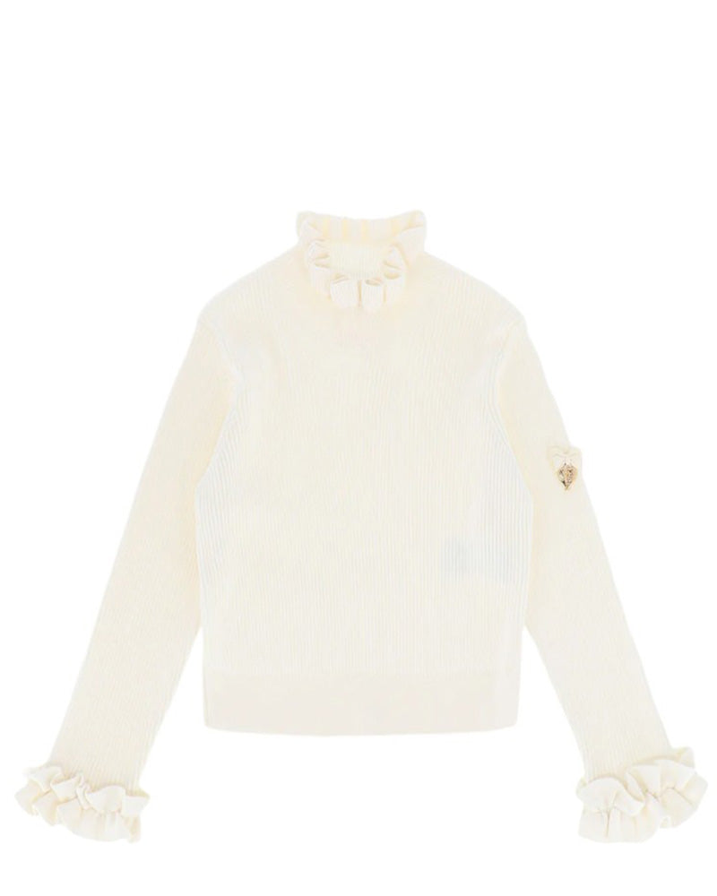 Maglia a costa con dettagli volant, balza sul collo e sui polsini, fiocco applicato, ciondolo a cuore dorato sulla manica.
