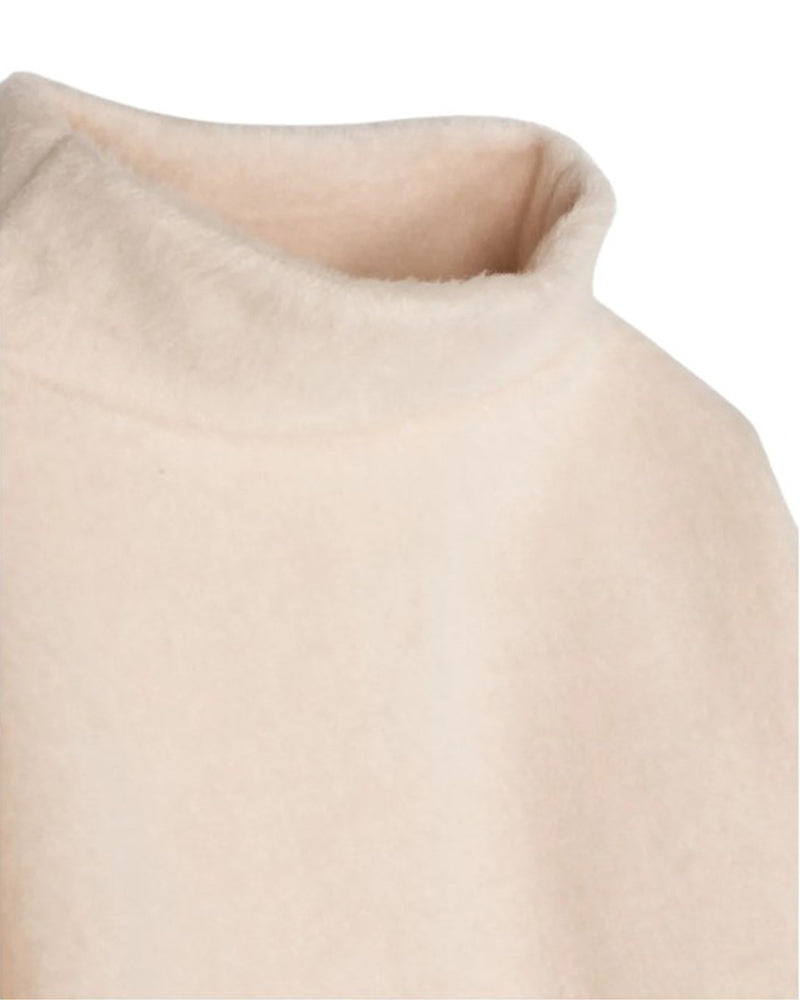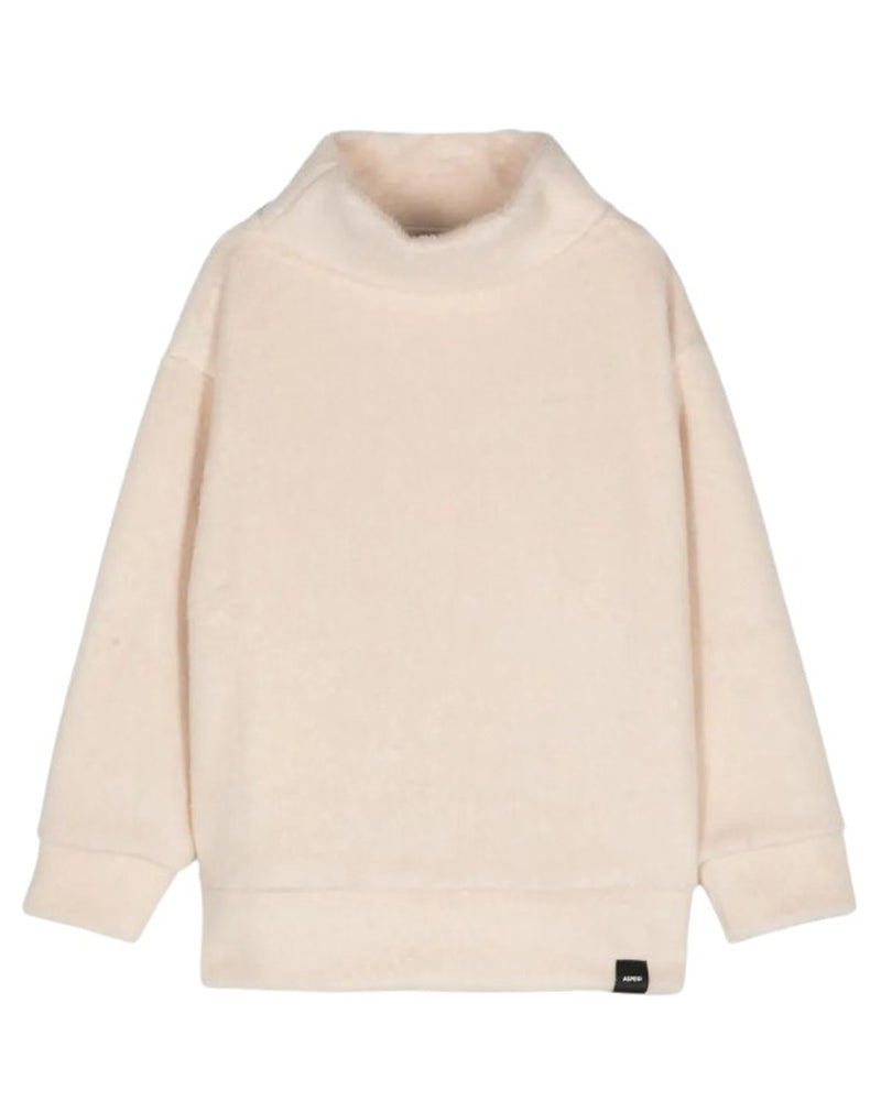 Maglia avorio realizzata in tessuto effetto spazzolato. Presenta colletto alto, maniche lunghe, fodera integrale, spacchi laterali e label logo applicata sul davanti.