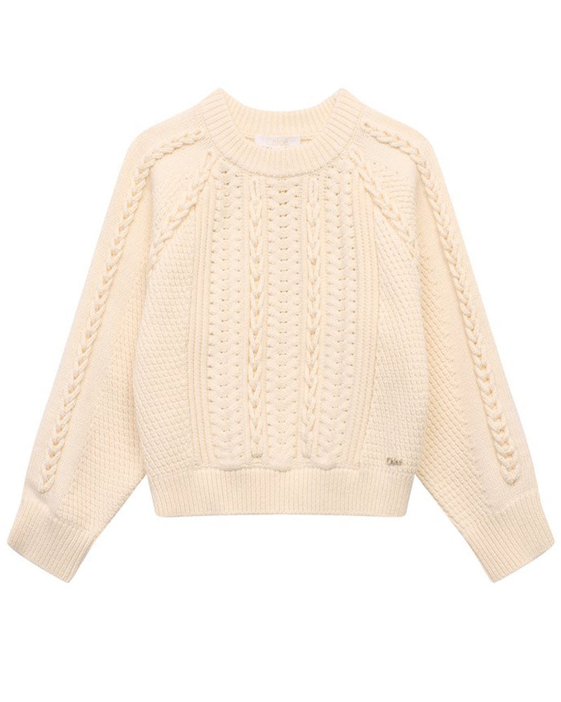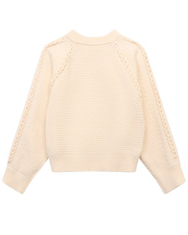 Maglia da bambina realizzata in misto cotone lavorata con dettagli a treccia. Presenta collo tondo, maniche lunghe e finiture a coste. È decorata con placca logo applicata sul lato