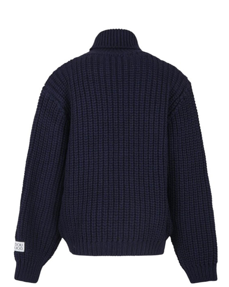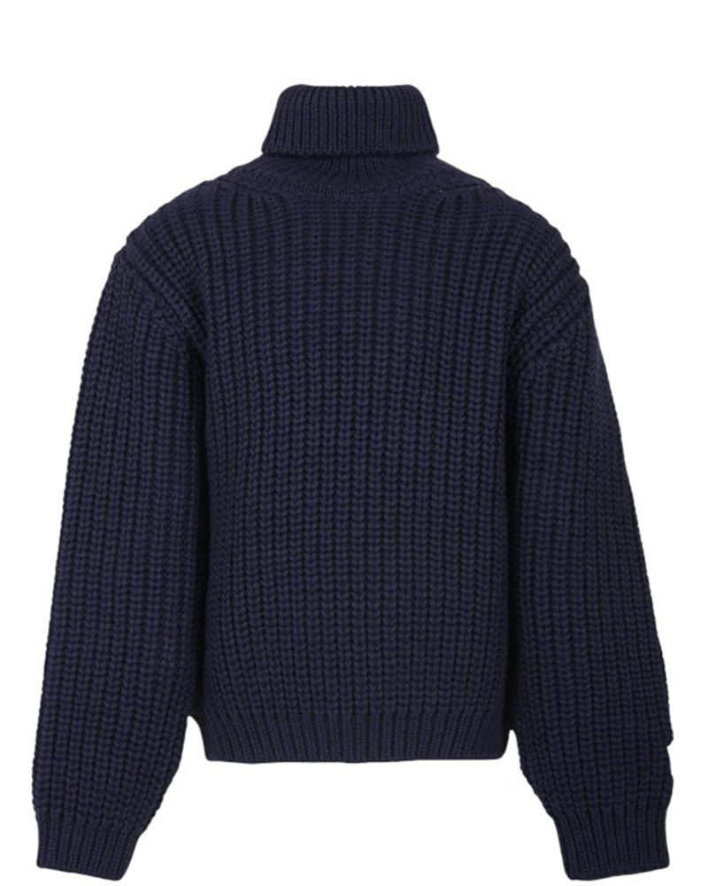 Maglia realizzata in lana da bambina. Presenta lavorazione a costina, collo alto, maniche lunghe, patch logo applicato sulla manica e finiture a coste.