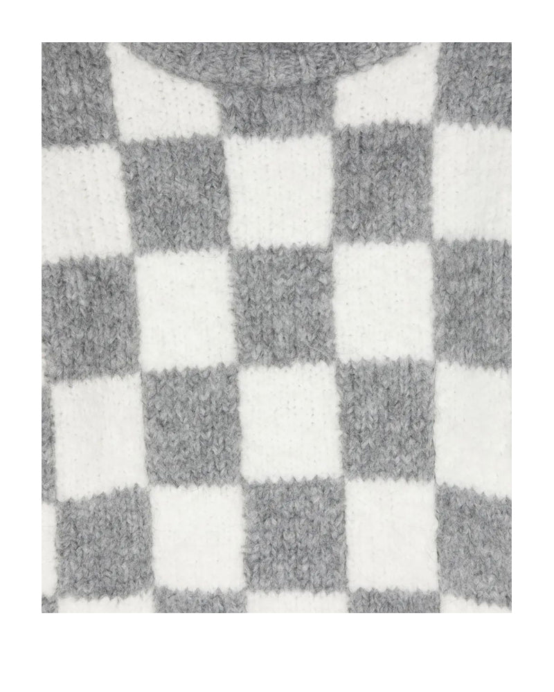 Maglia realizzata in misto lana effetto spazzolato da bambina. Presenta fantasia a quadri, collo tondo, maniche lunghe e finiture a coste. È decorata con patch logo applicata sulla parte posteriore.