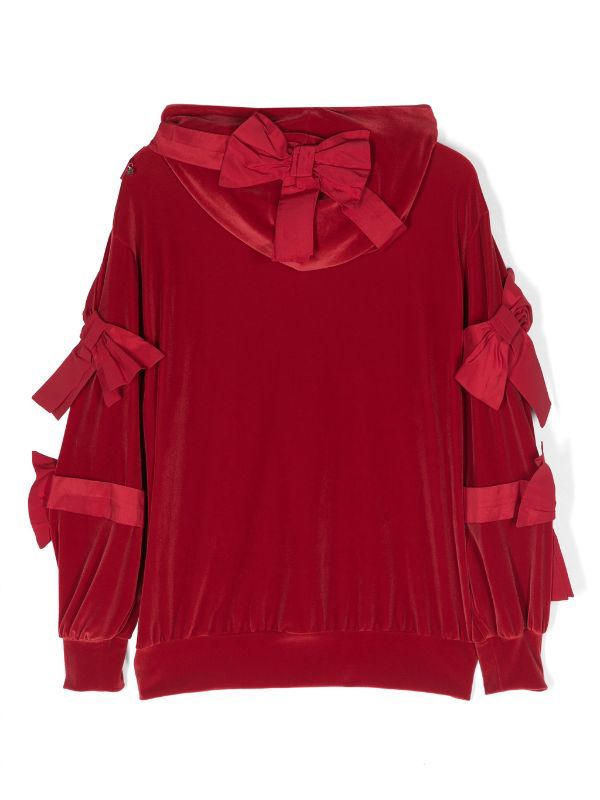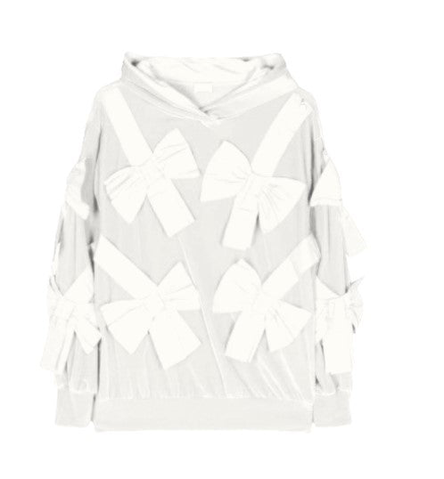 Maglia in ciniglia con cappuccio a manica lunga, applicazione fiocchi all over,