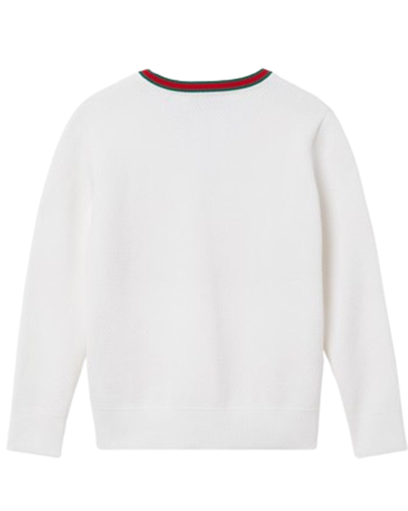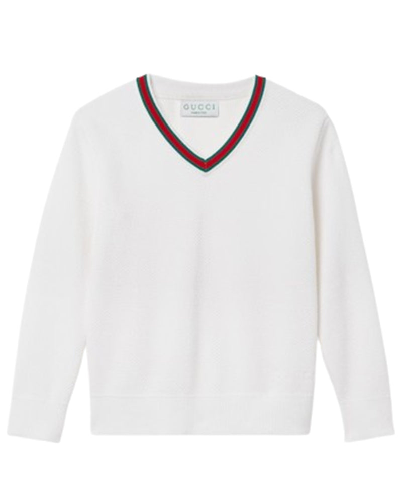 Maglia in cotone bianco, finiture con Web, ricamo Gucci, scollo a V, maniche lunghe, finiture a coste