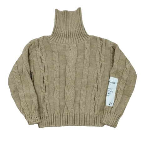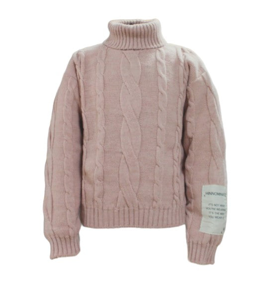 Maglia a collo alta in misto lana, motivo a treccia, patch logo applicato sulla manica, rifiniture a costa.