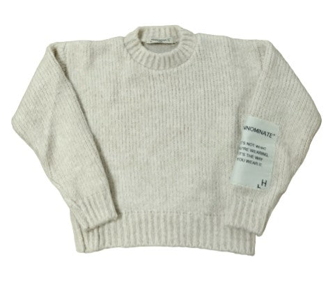 Maglia girocollo in misto lana da bambina, applicazione patch logo sulla manica, rifiniture a costa.