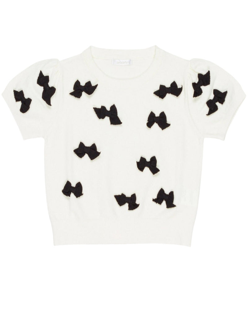 Maglia girocollo a maniche corte da bambina, applicazione con fiocchi neri sulla parte anteriore, finiture a coste.