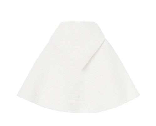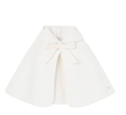 Cappa lavorata a maglia con cappuccio a punta. Chiusura con bottone in madreperla e fiocco. Ideale per completare tutti i suoi look.