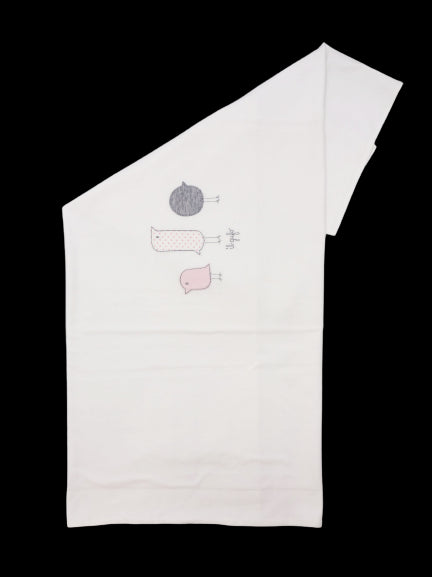 Copertina Il Gufo Neonata bianca con piccole uccellini centrali cuciti color grigio e rosa.
