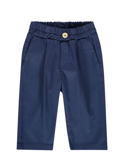 Pantalone in cotone con vita elasticizzata, taschine laterali, bottone decorativo sul davanti.