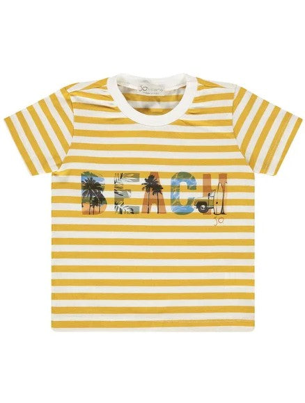 T-shirt in cotone manica corta girocollo, fatasia a righe, stampa "beach" sul davanti.