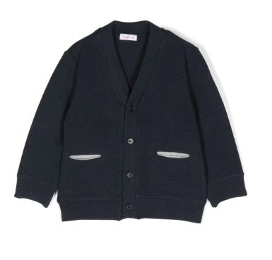 Maglia cardigan in felpa, scollo a V, taschine applicate sul davanti, bottoni di chiusura. girocollo, con ricamo in contrasto sul davanti, con bottoni di chiusura sulla spalla.