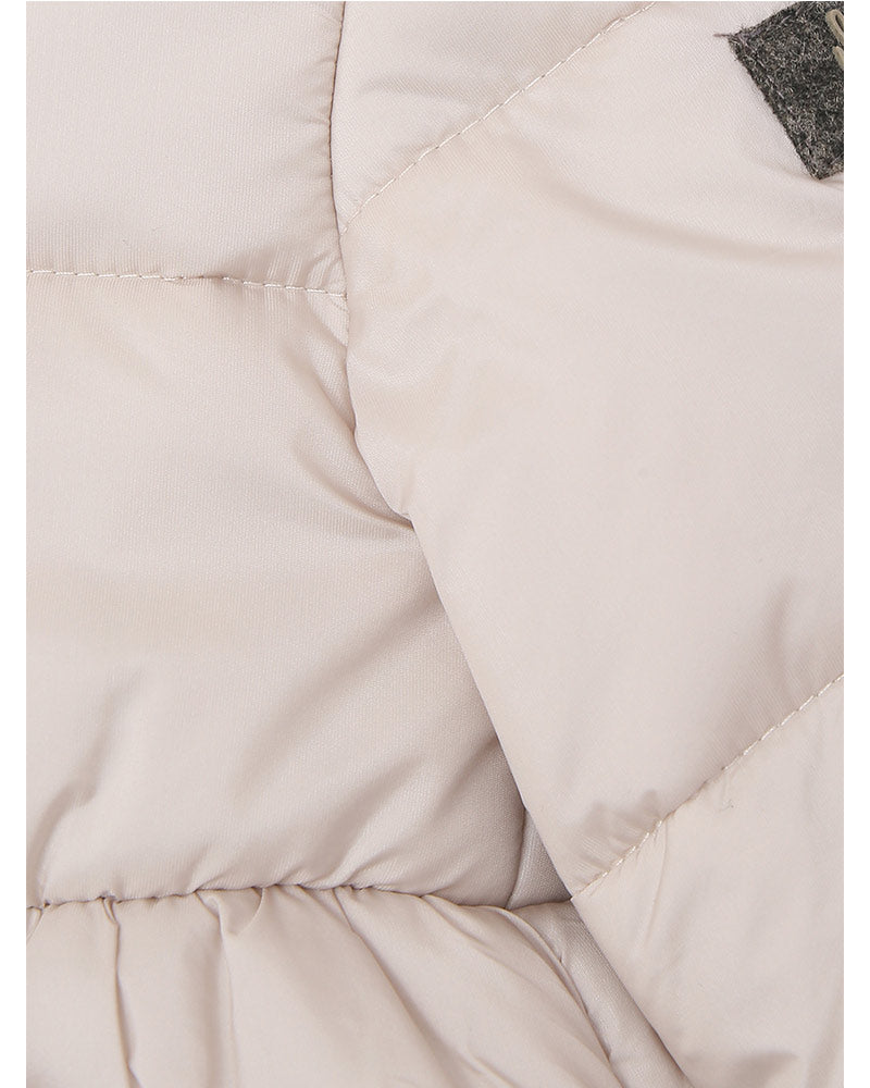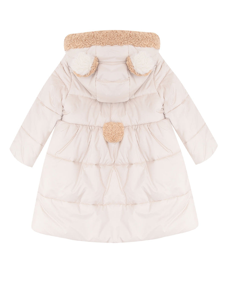 Giubbino imbottito da neonata, realizzato in nylon semilucido. Presenta cappuccio fisso con bordo in teddy e orecchie da animale, chiusura frontale con zip, maniche lunghe con polsi elasticizzati, due tasche a filetto laterali, taglio svasato e dettaglio con pompon sul retro. È decorato con patch logo applicata sulla manica.