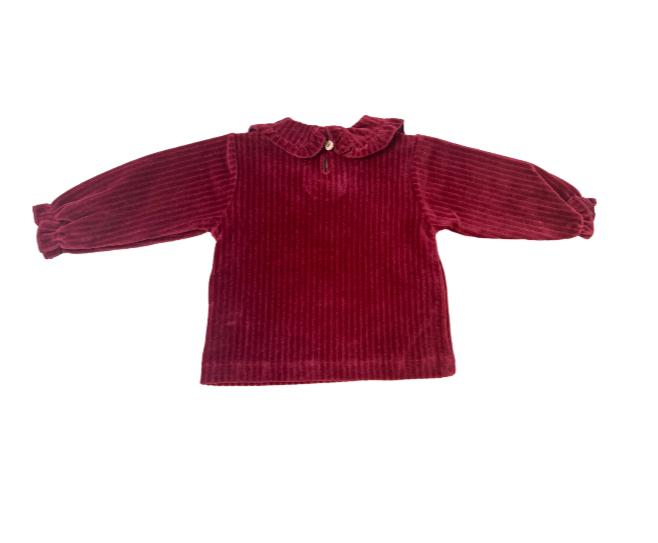 Maglia in velluto millerighe, colletto tondo, chiusura con bottoni sul retro.