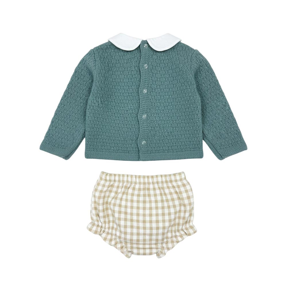Maglia con colletto tondo e taschina sul davanti abbinato al pantaloncino a culotte di tessuto a quadretti