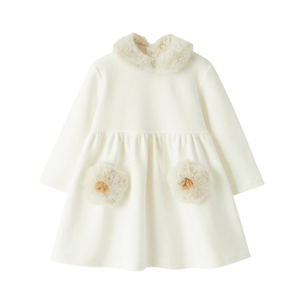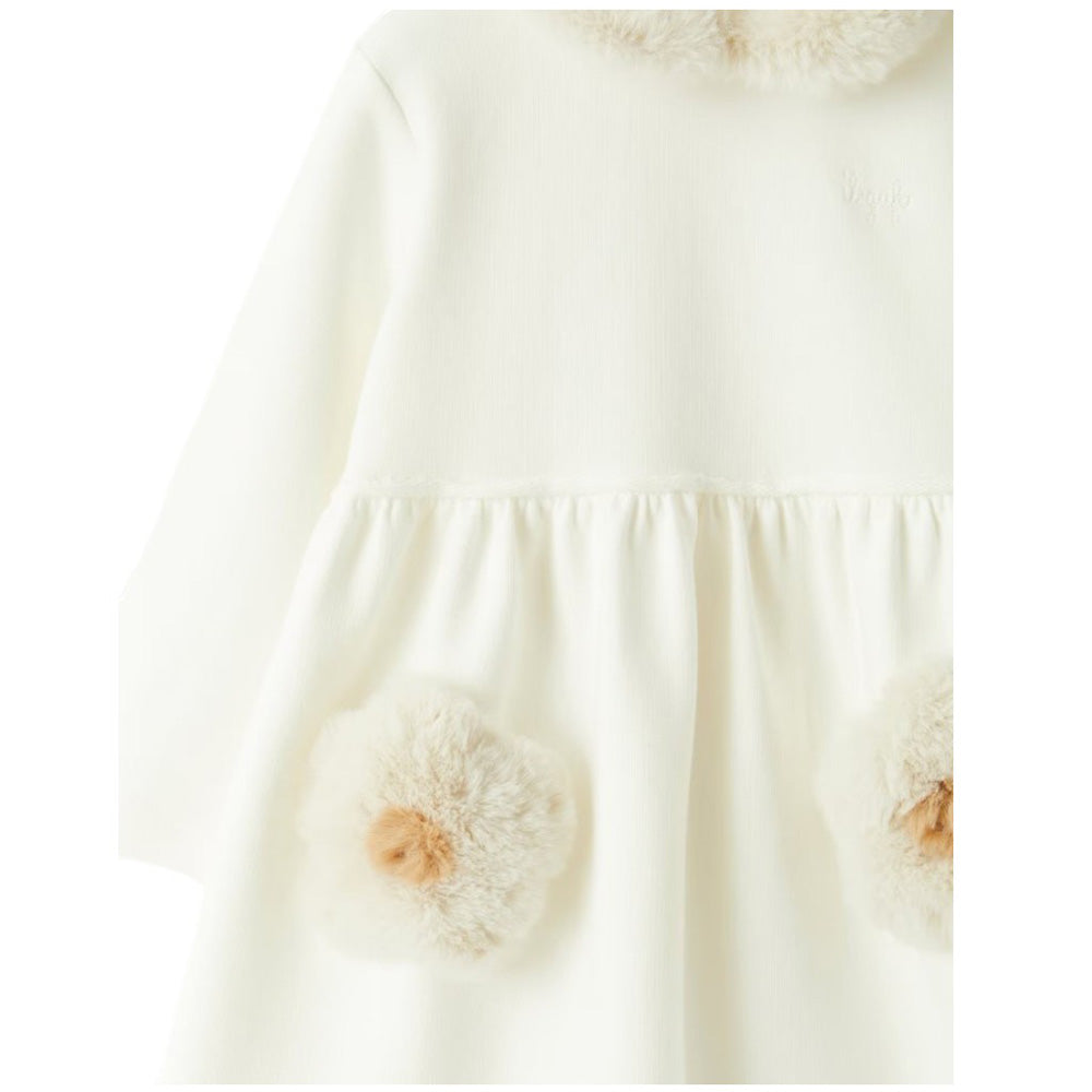 Vestina realizzata in jersey di cotone con taglio a impero. Presenta colletto alla Peter Pan in pelliccia ecologica, maniche lunghe e chiusura posteriore con bottoncini. È decorata con due fiori in pelliccia applicati sul davanti.
