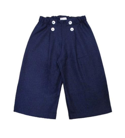Pantalone a palazzo, elastico in vita, pinces sul davanti, bottoni decorativi.