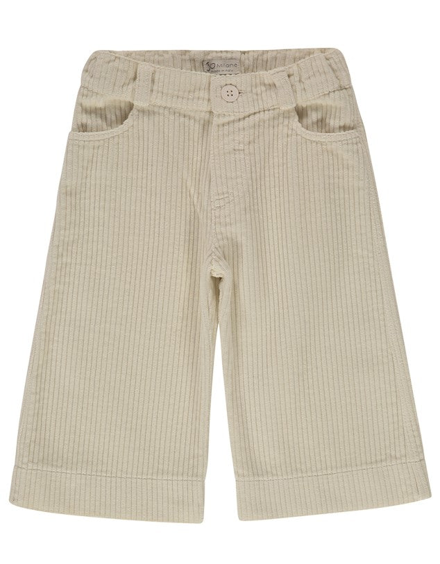 Pantalone a palazzo in velluto a coste, modello cinque tasche, chiusura frontale con bottoncino.