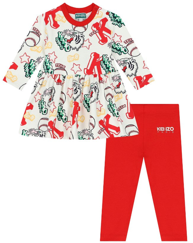 Vestina girocollo a manica lunga realizzata in felpa di cotone, presenta stampa all-over, chiusura con bottoncini a pressione sulla spalla e gonna svasata. Leggings elasticizzato, con logo stampato sul davanti.