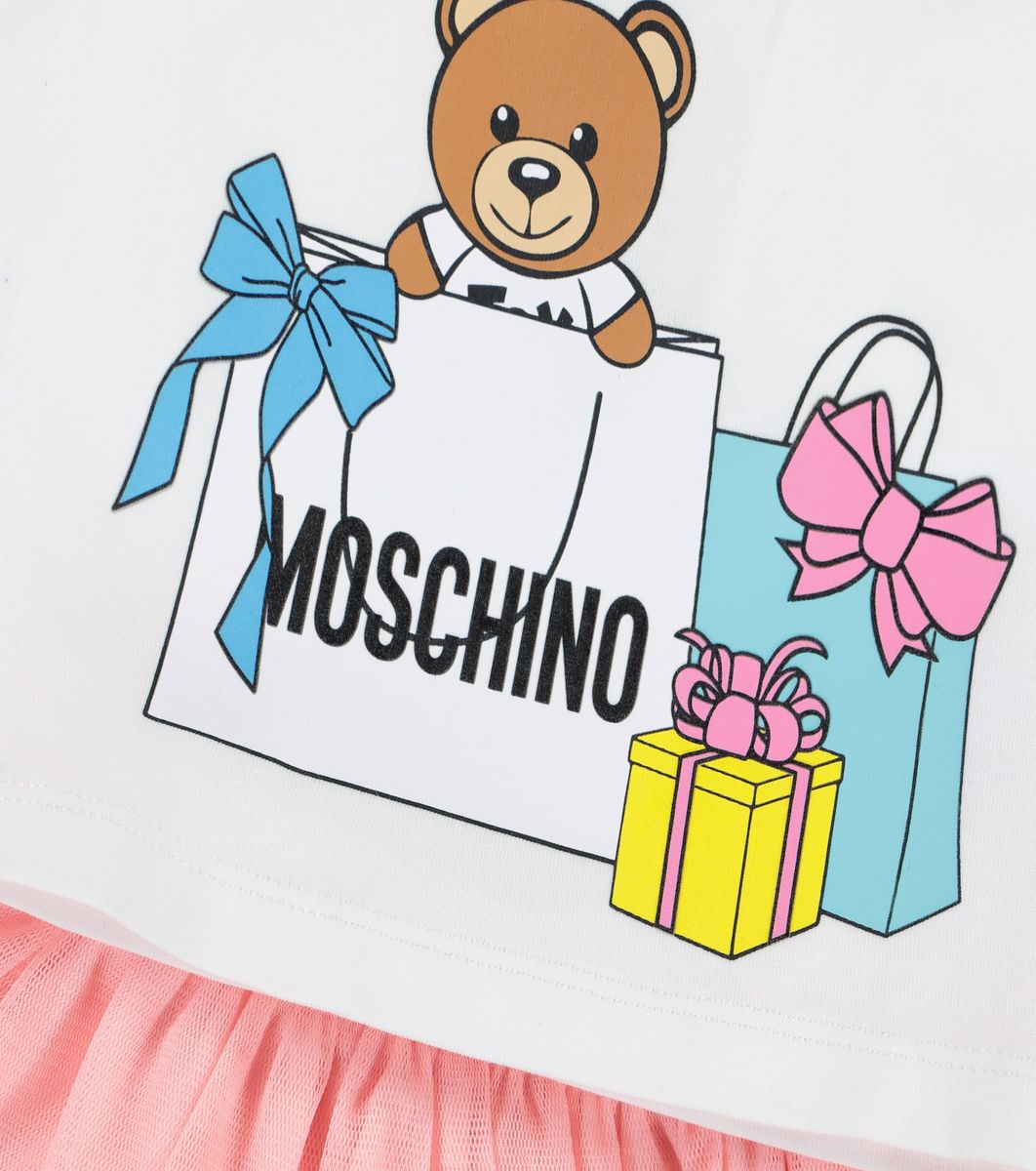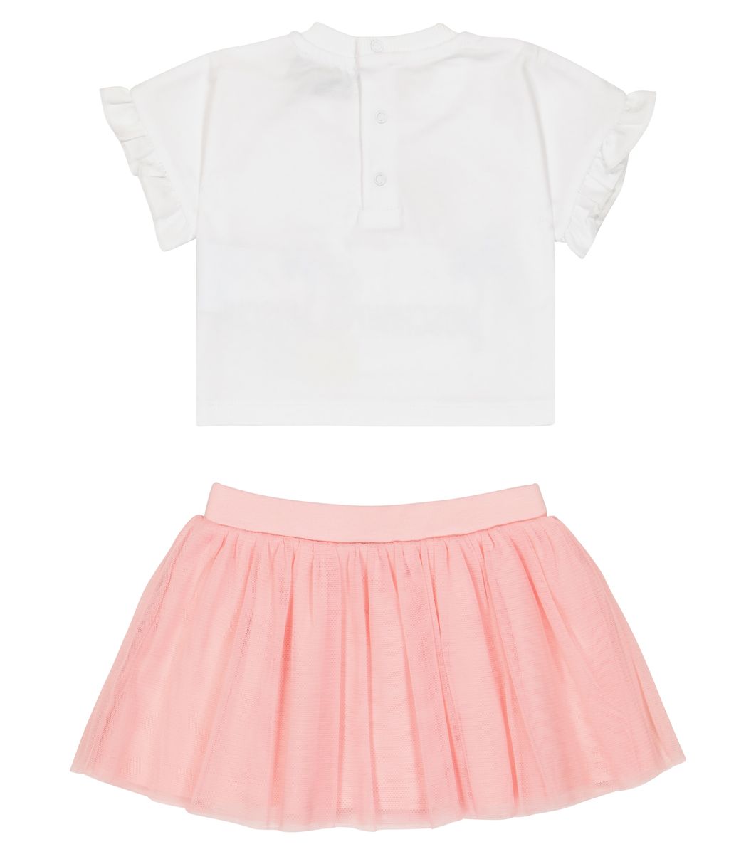 Completo due pezzi composto da t-shirt girocollo con stampa a logo sul davanti. Gonna in tulle con vita elasticizzata.