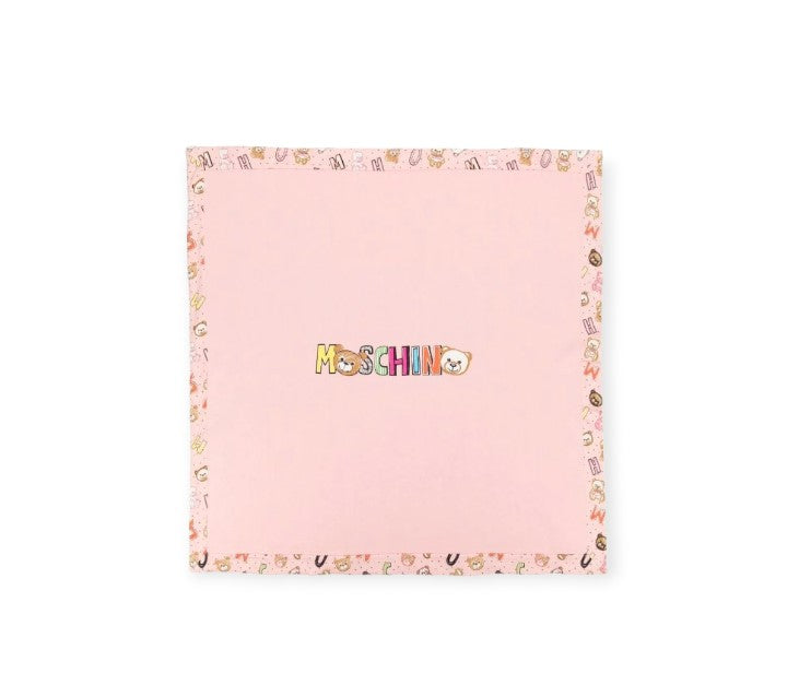Copertina Moschino reversibile: Teddy e lettere all-over su di un lato e semplice solo con scritta multicolor sull'altro.