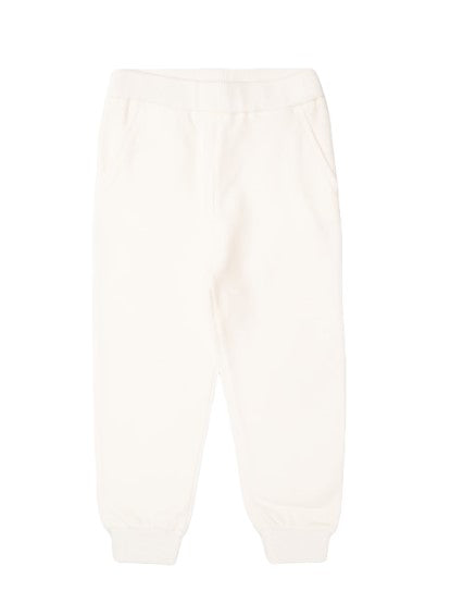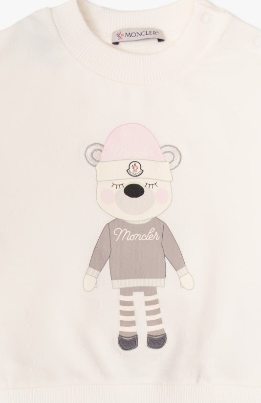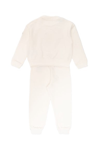 Completo due pezzi realizzato in jersey di cotone. Composto da felpa girocollo con stampa frontale, clips di chiusura sulla spallina e bordi a costine. Pantalone jogger, con elastico in vita ed alla caviglia.